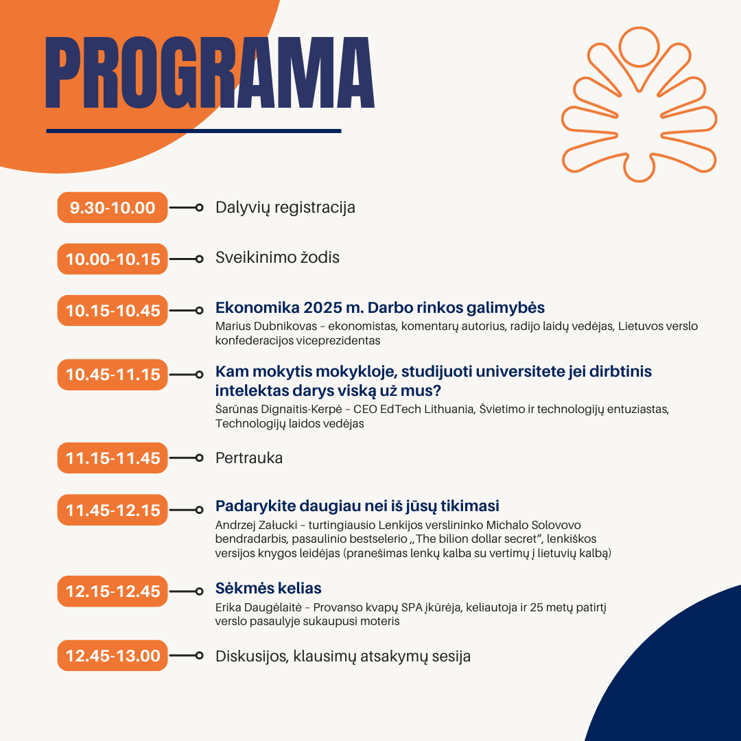 Vilniaus rajono pedagoginė psichologinė tarnyba 2024 m. gruodžio 10 dieną, 10.00-13.00 val. organizuoja karjeros ir verslumo ugdymo konferenciją jaunimui „Nuo nulio iki milijardo“.