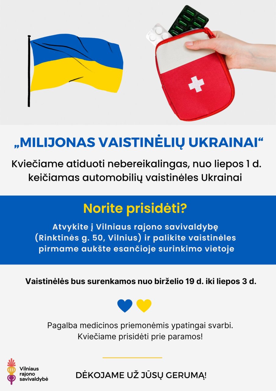 Prie akcijos prisijungia ir Vilniaus rajono savivaldybė. Visi norintys automobilių vaistinėles paaukoti Ukrainai, kviečiami atvykti į Vilniaus rajono savivaldybę (Rinktinės g. 50, Vilnius) ir pirmame aukšte esančioje dėžėje palikti nereikalingas automobilines vaistinėles.